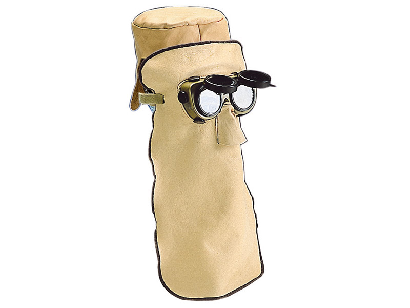 aus weichem Leder mit Kevlar Garn genäht, zum Schutzgsasschweißen in Zwangslagen, langer Latz 45cm, mit Nasenaustritt, klappbar, mit Lederhaube, Glasgröße 50mm, ohne Gläser |
