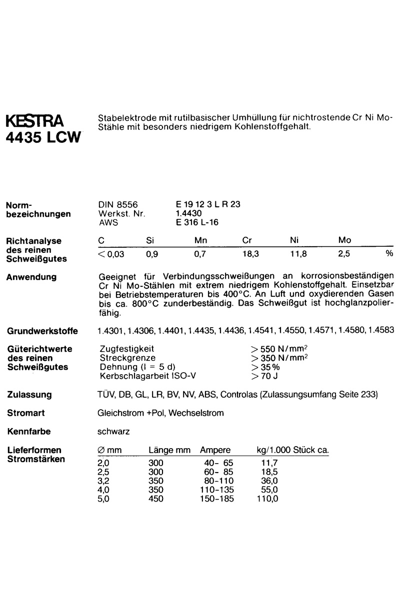 EN ISO 3581-A: E 19 12 3 L R 12: rutilbasisch umhüllte Elektrode für artähnliche austenitische Cr-Ni-Mo-Stähle und Stahlgusssorten, fast spritzerfreier Werkstoffübergang und vorwiegend selbstlösende Schlacke, gutes Zünden und Wiederzünden ; mit Klick auf das Bild öffnet sich das Datenblatt |